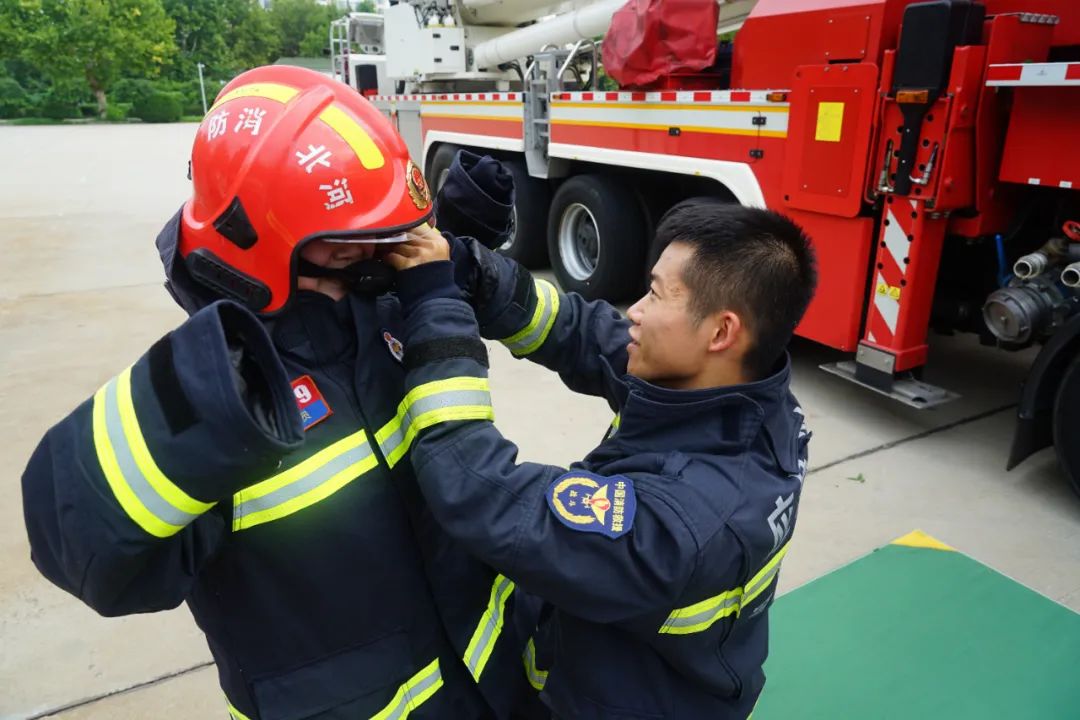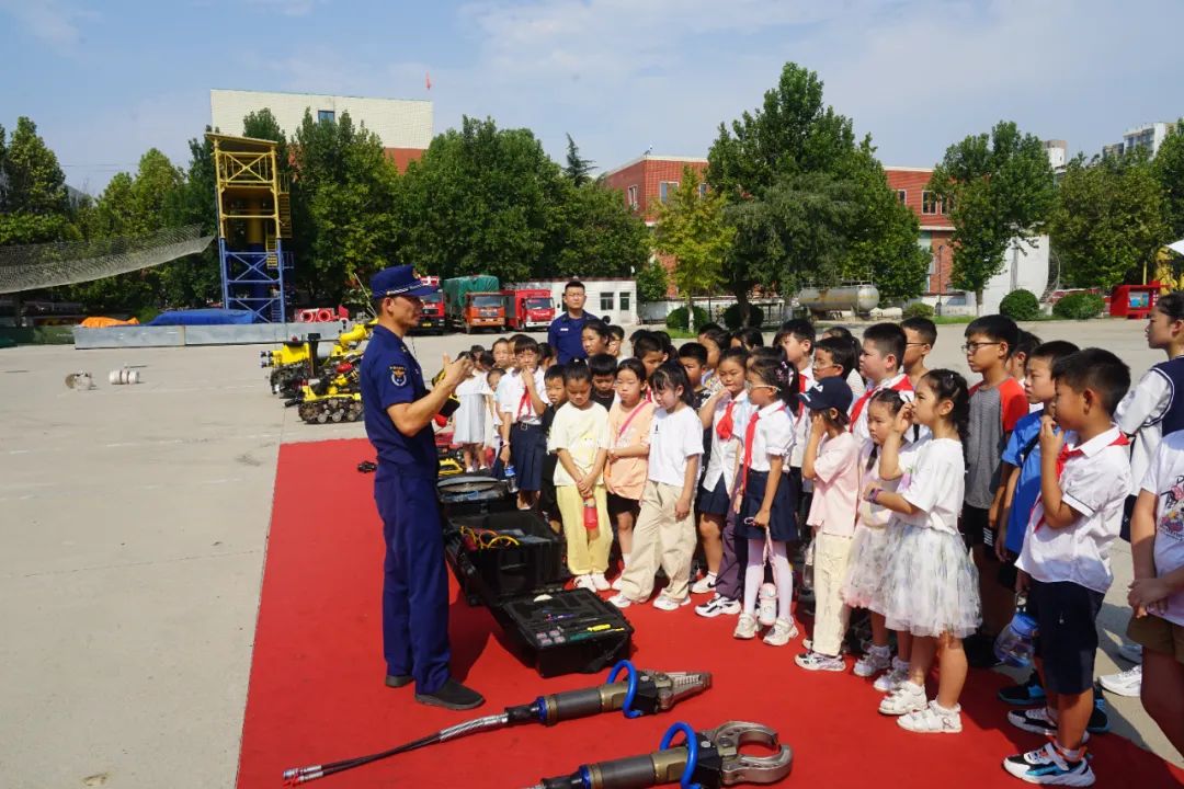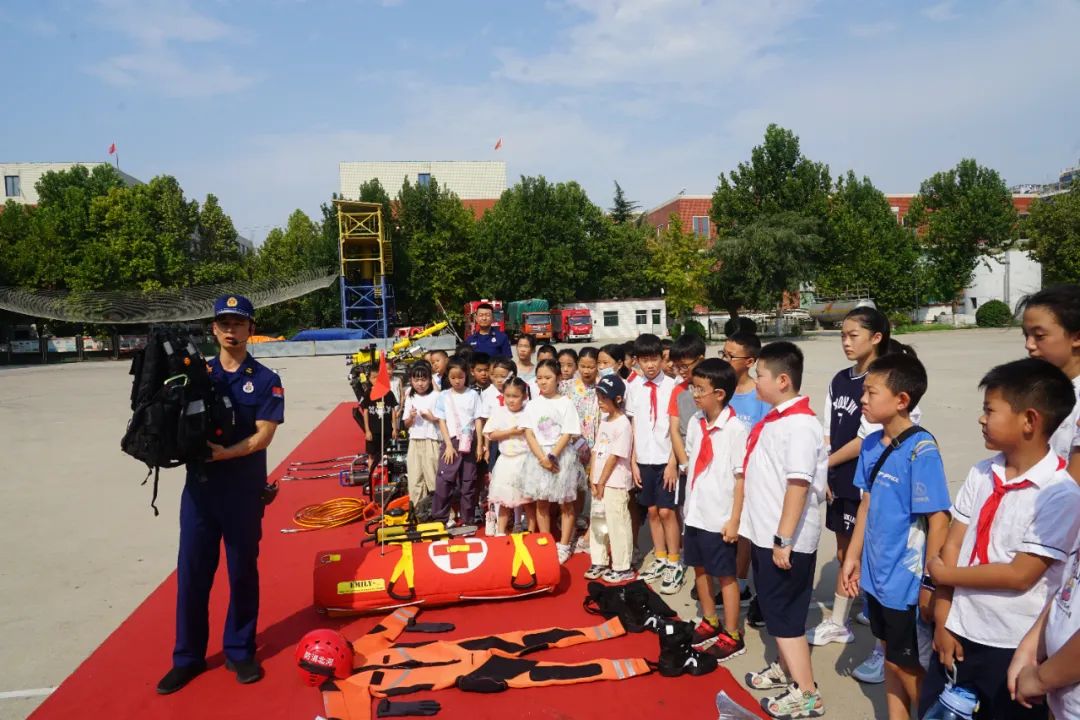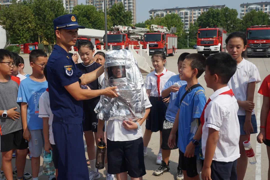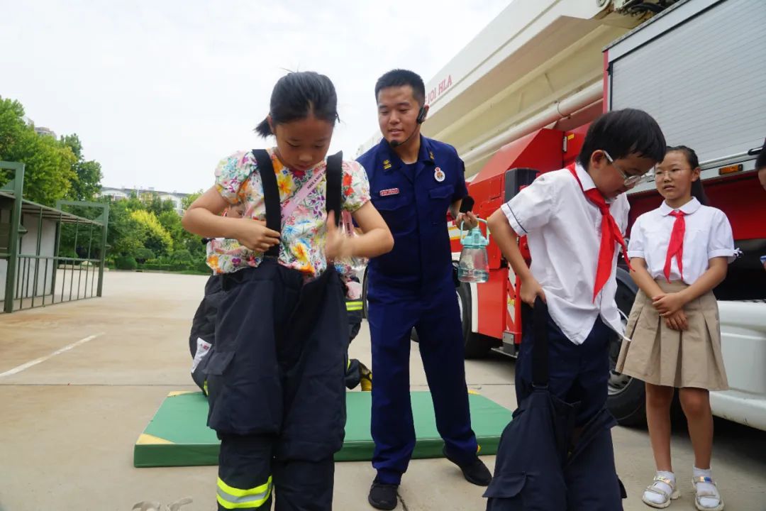 消防员向小记者们展示了灭火救援服的穿戴方法