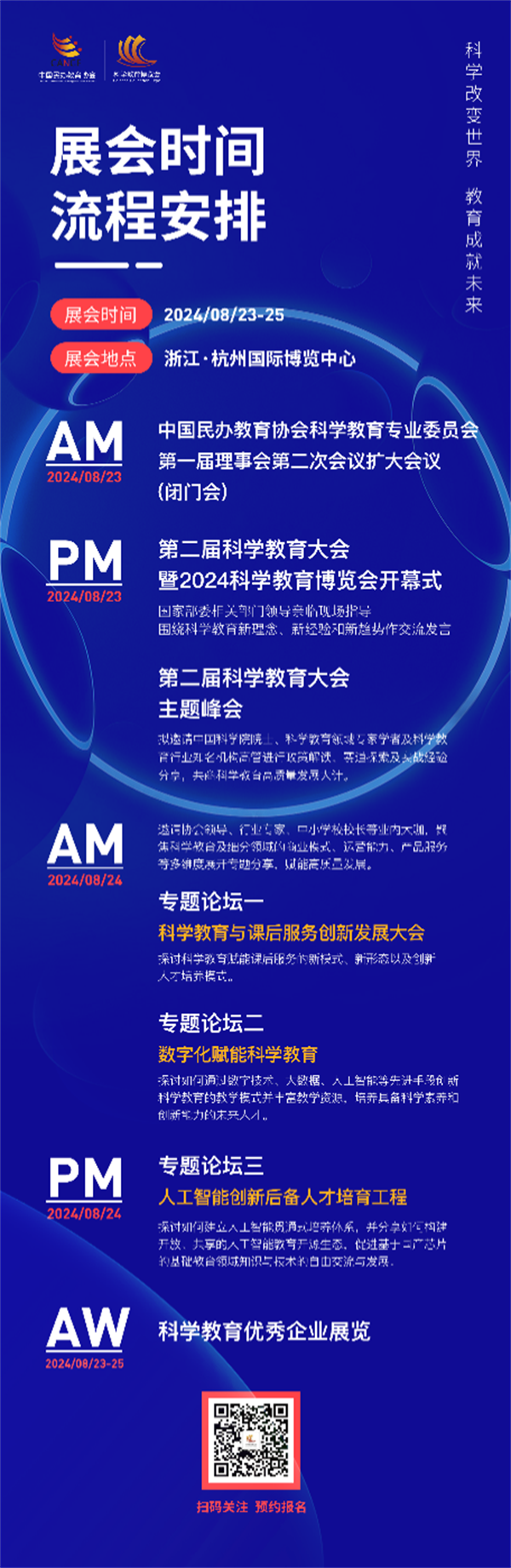 8月23日至8月25日,由中国民办教育协会科学教育专业委员会联合杭州日报报业集团共同主办的第二届科学教育大会暨2024科学教育博览会在杭州国际博览中心3B展厅举行,本届大会以“科学改变世界 教育成就未来”为主题,由一场主题峰会,一场展览,三场分论坛组成,众多科学教育领域的领军人物和企业汇聚一堂,为公众呈现一场集知识性、趣味性和互动性于一体的科学教育体验。