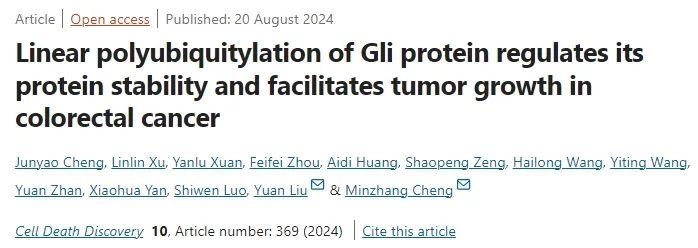 总之,本研究发现,Gli蛋白是线性多泛素化的新型底物,这有助于Hh信号通路的激活并促进结直肠癌细胞的增殖。