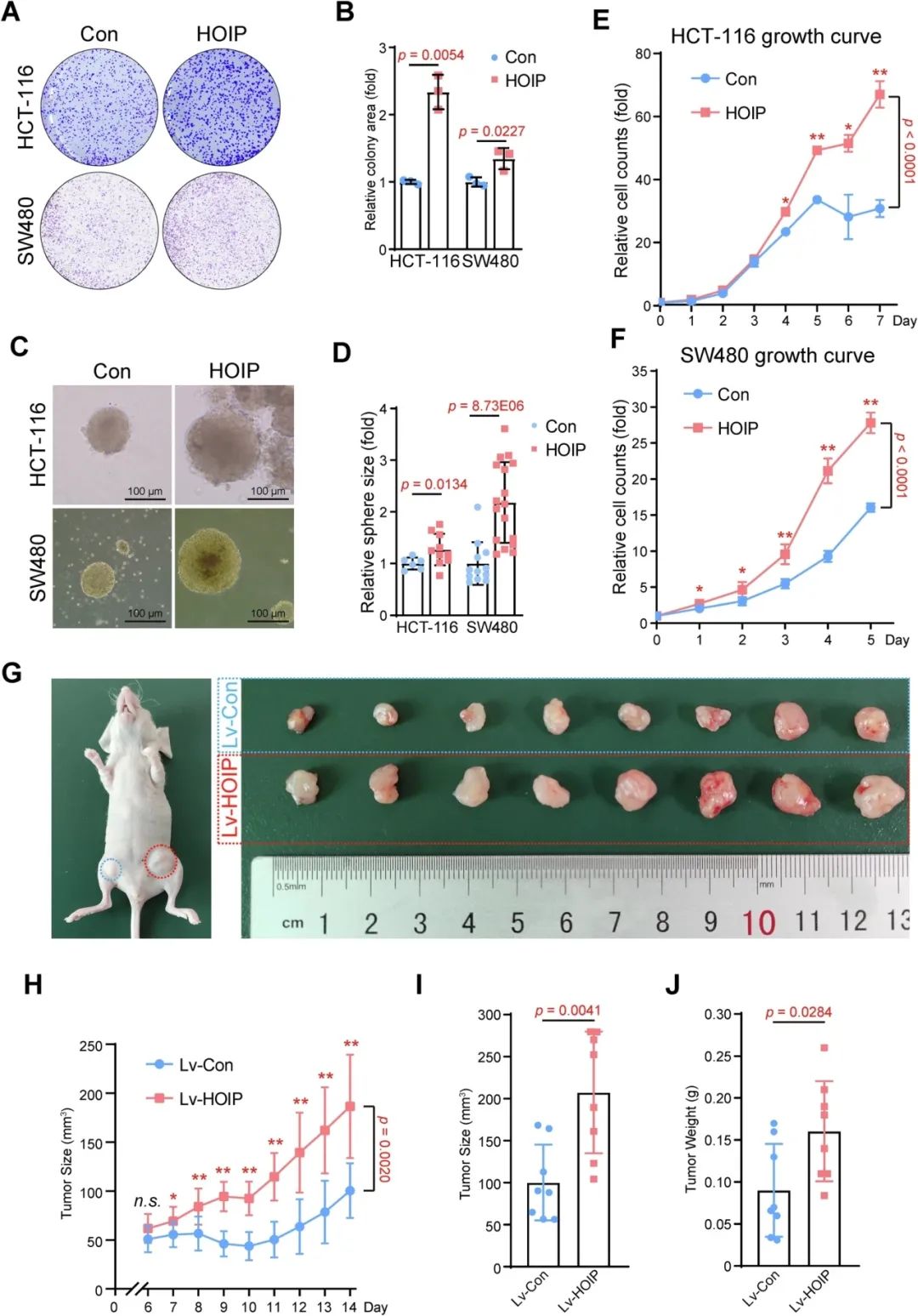 研究人员在两种不同的结直肠癌细胞系HCT-116和SW480中构建了HOIP的异位表达。克隆形成实验表明,HOIP在两种结直肠癌细胞系中都促进肿瘤细胞生长,这一结论在软琼脂中的球形形成实验中得到了进一步证实。此外,研究人员使用CCK-8试剂盒每天对细胞进行活体检测,以生成细胞生长曲线,结果显示HOIP促进结直肠癌细胞的增殖。