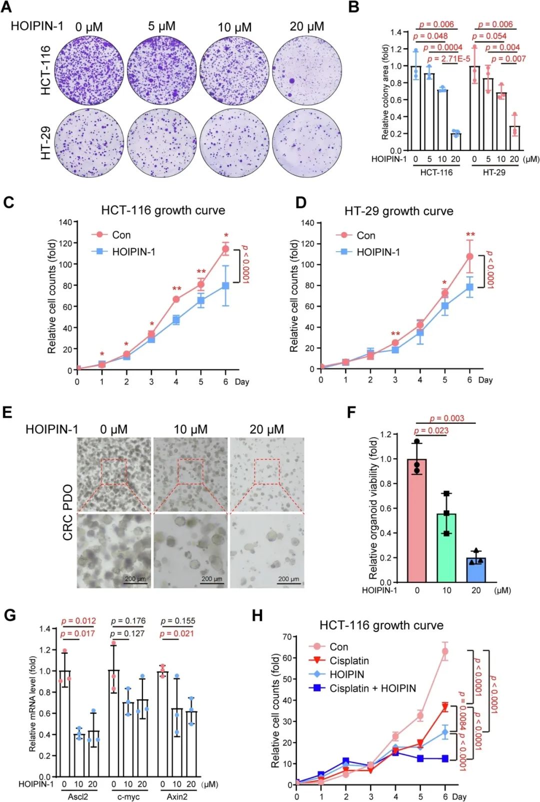 为了进一步探索HOIPIN-1在结直肠癌治疗中的潜力,研究人员使用了来自结直肠组织的患者来源的器官样体(PDOs)。如图2E和F所示,HOIPIN-1治疗减少了PDOs的数量,并抑制了Ascl2和Axin2的表达,表明HOIPIN-1对结直肠器官样体的干细胞特性和细胞增殖具有抑制作用。尤其是,HOIPIN-1只抑制了来自结直肠组织的器官样体的生长,而对来自正常肠道组织的器官样体没有影响,这表明LUBAC在肿瘤或正常组织中的功能是内容依赖的。
