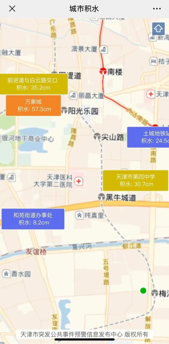 出现降雨后,排管中心快速反应,及时开启雨水泵站强排雨水。截止12时,中心城区共出现西南楼地区、梅江地区,气象台路、南市地区、六纬路等21处积水情况;金钟河地道、新开路地道、海河西路金埠桥下沉路、东风地道四处地道下沉路出现积水,目前已经陆续退水恢复通行,仍有东风地道1处断交。