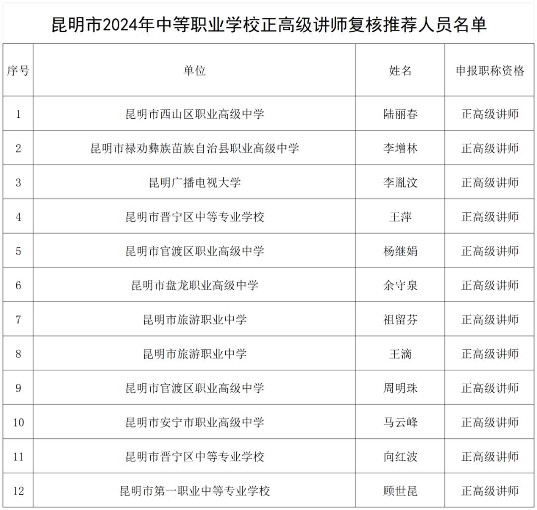 昆明市2024年度中小学正高级教师、中等职业学校正高级讲师复核推荐人选公示