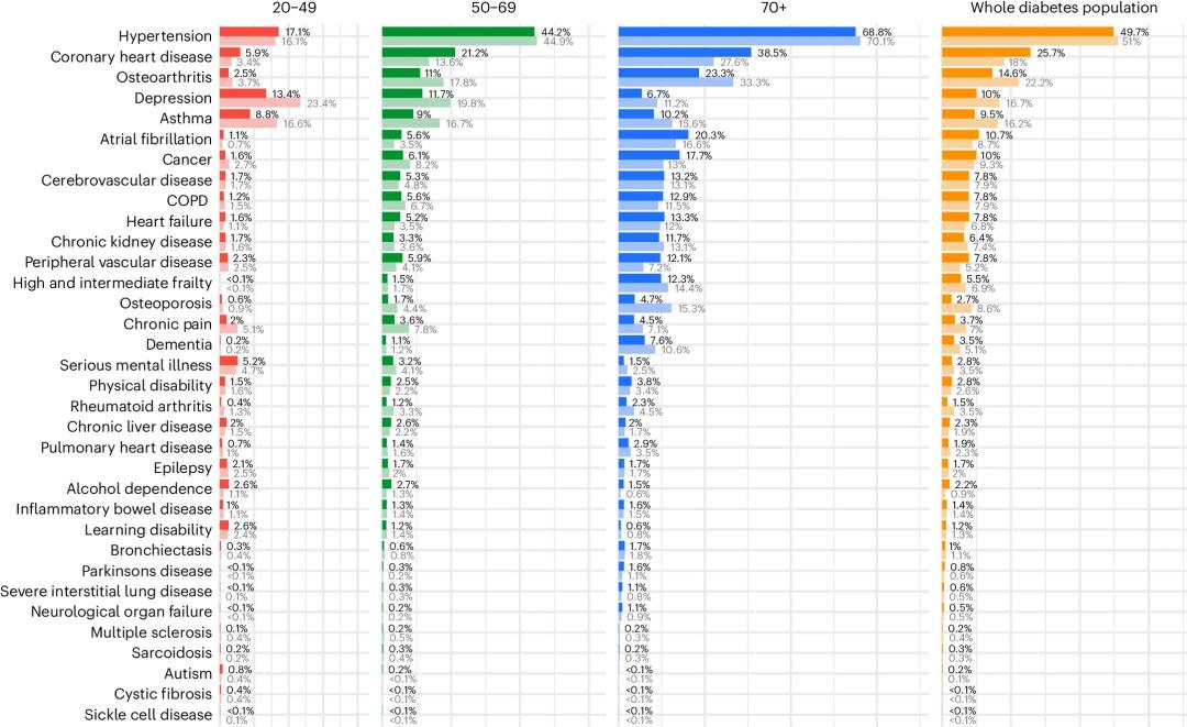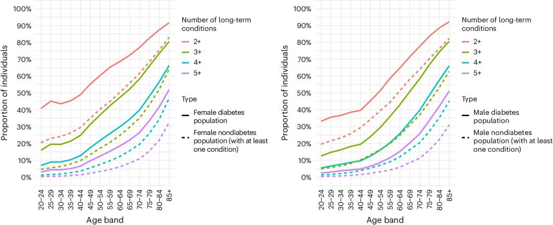 从图中可以看出,无论年龄段,糖尿病患者都较非糖尿病人群患多重长期疾病比例更高。在50岁时,37%的女性患者和29.4%的男性患者至少患有三种疾病,而在一般人群中,这个程度的疾病负担起码要到65或70岁后才成为普遍情况。在低年龄段时,糖尿病患者和非糖尿病人群的多重长期疾病负担差异更大。