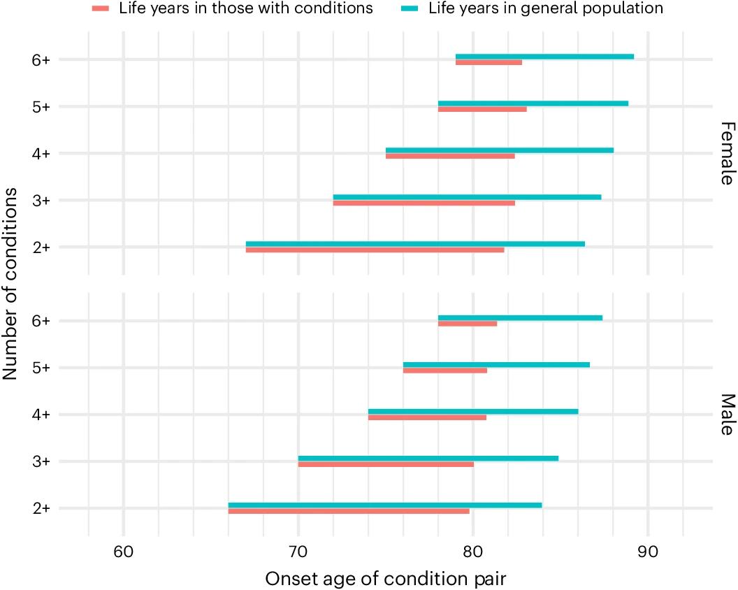 如果在青年期就患上多重长期疾病,那么对寿命损失的影响是更大的。举例来说,在40岁时患病,每多患一种疾病寿命就会减少4年。