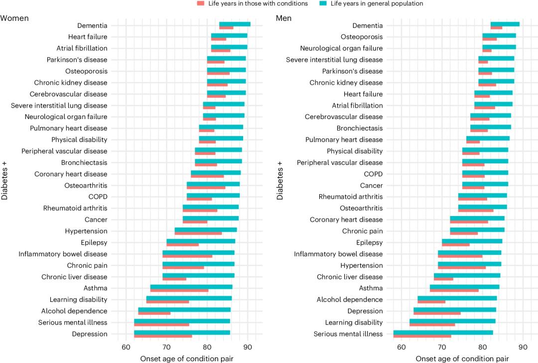 糖尿病患者患上至少两种多重长期疾病的中位年龄为67岁(女性)/66岁(男性),这意味着随后的漫长人生都要与疾病相伴。而年龄愈长,多重长期疾病负担也愈重,寿命损失愈多。