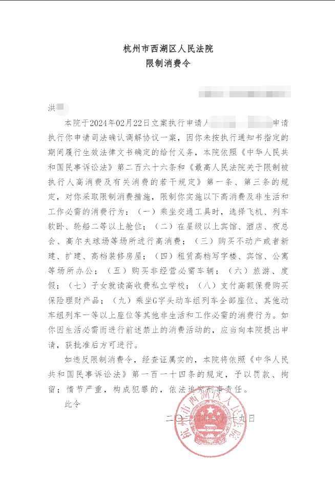 邹先生表示,案件并未进入庭审程序,因为在诉前调解阶段,洪某仍答应弥补损失,双方达成调解。因洪某未按照执行通知书履行义务,今年6月19日,杭州市西湖区人民法院下发了《限制消费令》,洪某被列入“限高”名单。