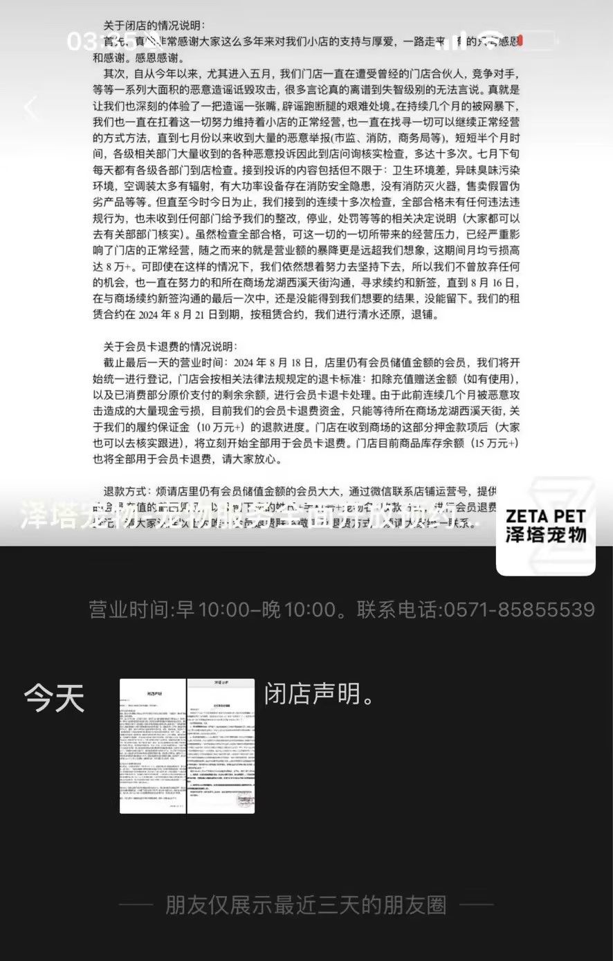 泽塔宠物在微信朋友圈发布《闭店声明》。