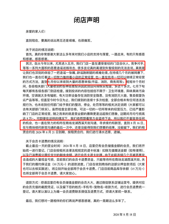 《闭店声明》提到,“泽塔宠物”和西溪天街的租赁合约在8月21日到期,本意争取续约,但未能成功。对于充值会员退卡的部分,该声明称:“门店在收到商场10万元履约保证金退款后,会立即用于会员卡退费,门店15万元的商品库存余额也会全部用于会员卡退费。”