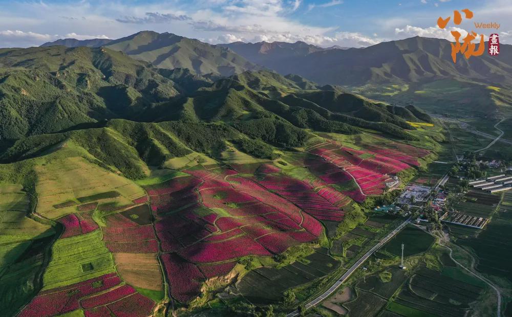 盛夏,这里高耸云天,满山翠绿,蓝天白云下,如波浪般的山坡上,金色点缀山谷,鲜黄映衬碧绿,玫红耀眼夺目,将祁连山脚妆点的五彩斑斓。