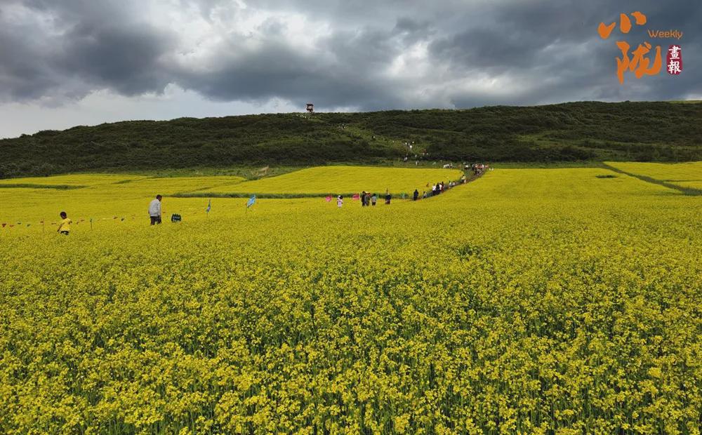 一场细雨过后,微风吹拂,金黄色的花朵随风摇曳。游客们置身花海,赏花、拍照,尽情享受大自然馈赠的田园诗意。
