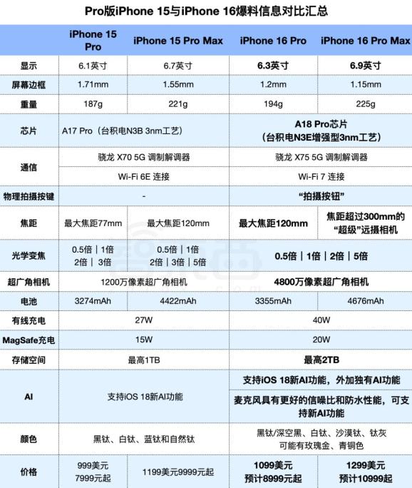 ▲Pro版iPhone 15与iPhone 16爆料信息对比汇总