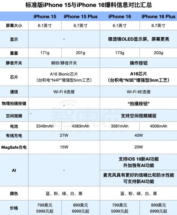 ▲标准版iPhone 15与iPhone 16爆料信息对比汇总除了这些信息外,今年你对iPhone 16还有哪些期待?