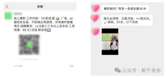 根据用户投诉发现,近期有不法分子以“兼职”为幌子,在朋友圈、微信群发布“帮发朋友圈换米”“闲置小号换零花钱”等相关内容。提醒大家切勿参与!这些不法分子可能会指派你发布含有无资质产品的广告内容(如虚假减肥产品宣传)、招嫖类不良信息、欺诈引流类内容(如宣称刷单可获双倍返现)等。