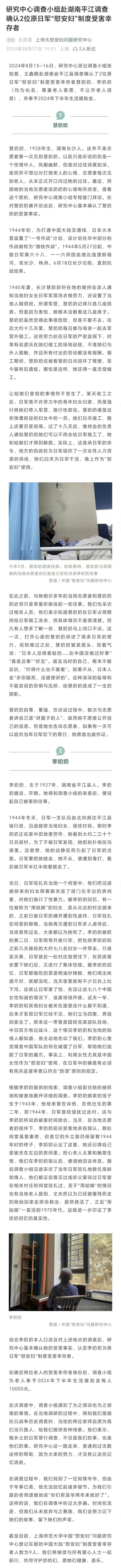 据上师大慰安妇问题研究中心27日消息,2024年8月13—16日,研究中心派出调查小组赴湖南省平江县调查确认了2位原日军“慰安妇”制度受害幸存者慧奶奶、李奶奶(均为化名,尊重老人意愿,不公开老人信息)。