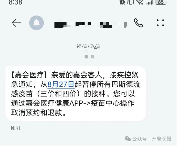 上海网友收到的暂停疫苗接种的短信通知8月27日,上海嘉会医疗客服回复称,医院是接到了上海市疾控中心方面的通知,目前上海所有医院已经暂停所有巴斯德流感疫苗的接种。对于已经接种该疫苗的客户,需要等待官方消息。