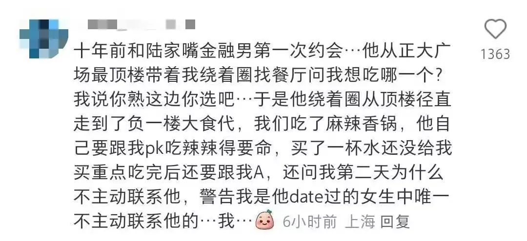 “金融大鳄们既想要面子,又不想在恋爱中花太多的钱。因此有些人会邀请你去贵价餐厅,却点便宜的菜。不愿意和他们约会,不是嫌他们抠搜。实在是因为自己跟他在一起,还没单身的时候吃得饱。”