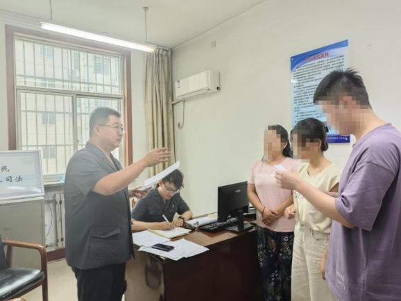 图为今年6月17日,陕西省宝鸡市金台区人民法院执行局副局长李凡(左一)就一起民间借贷案件向当事人进行释法说理。资料图片2023年8月某天一大早,陕西省宝鸡市金台区人民法院执行局副局长李凡正在办公室办公,忽然,一阵焦急的呼喊声打破了宁静。