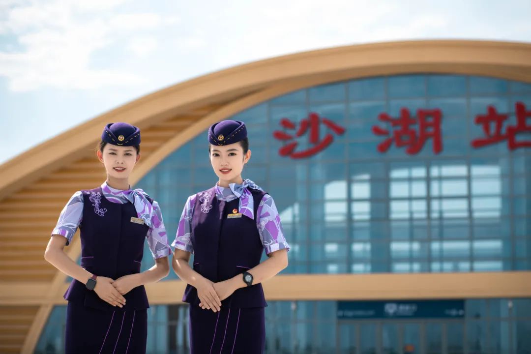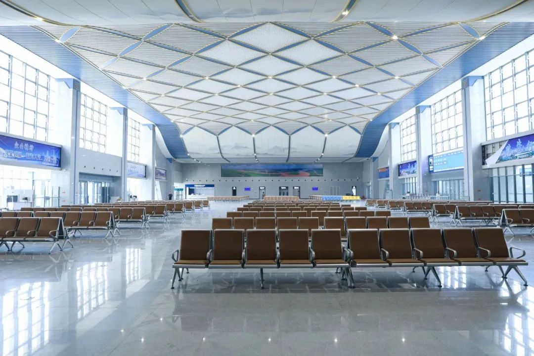 站房主体轮廓似连绵起伏的沙丘,立面的通透幕墙如荡漾的湖水,室内装修延续着沙丘的形态,彰显出独特的地理风貌。