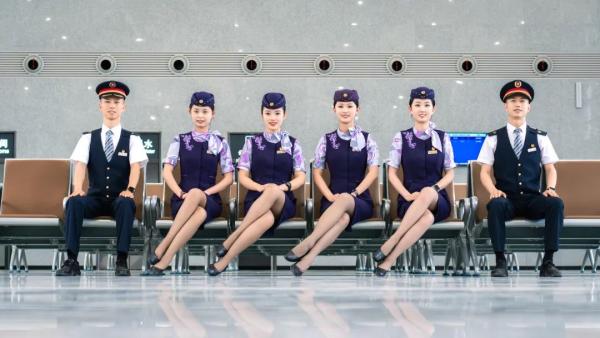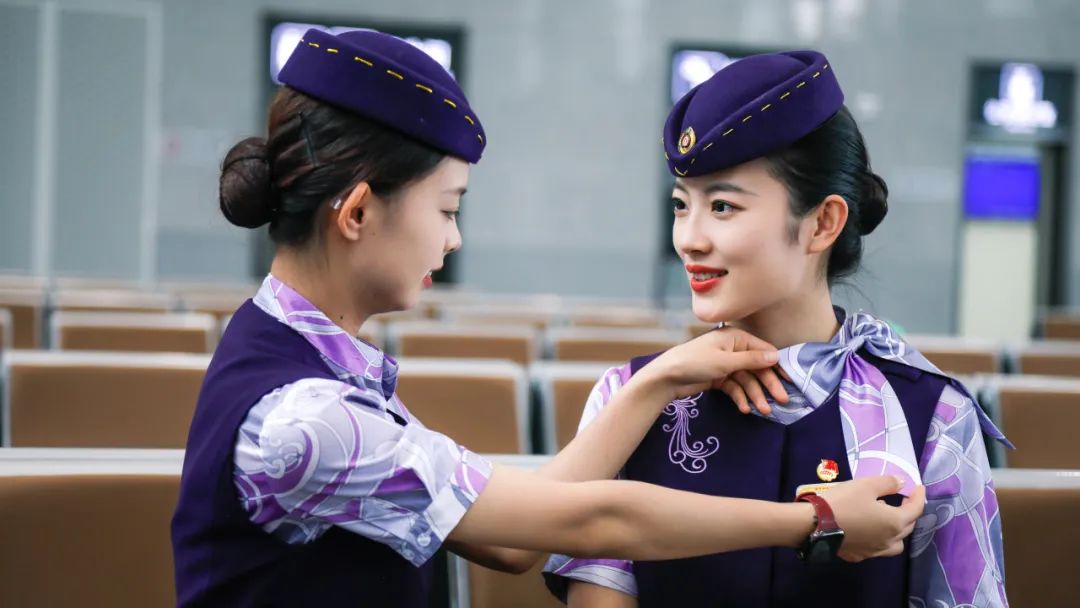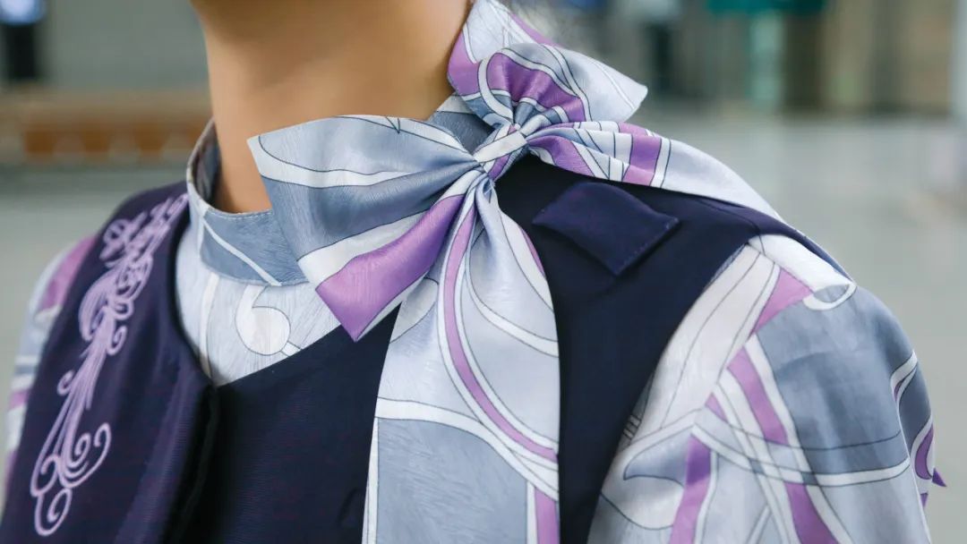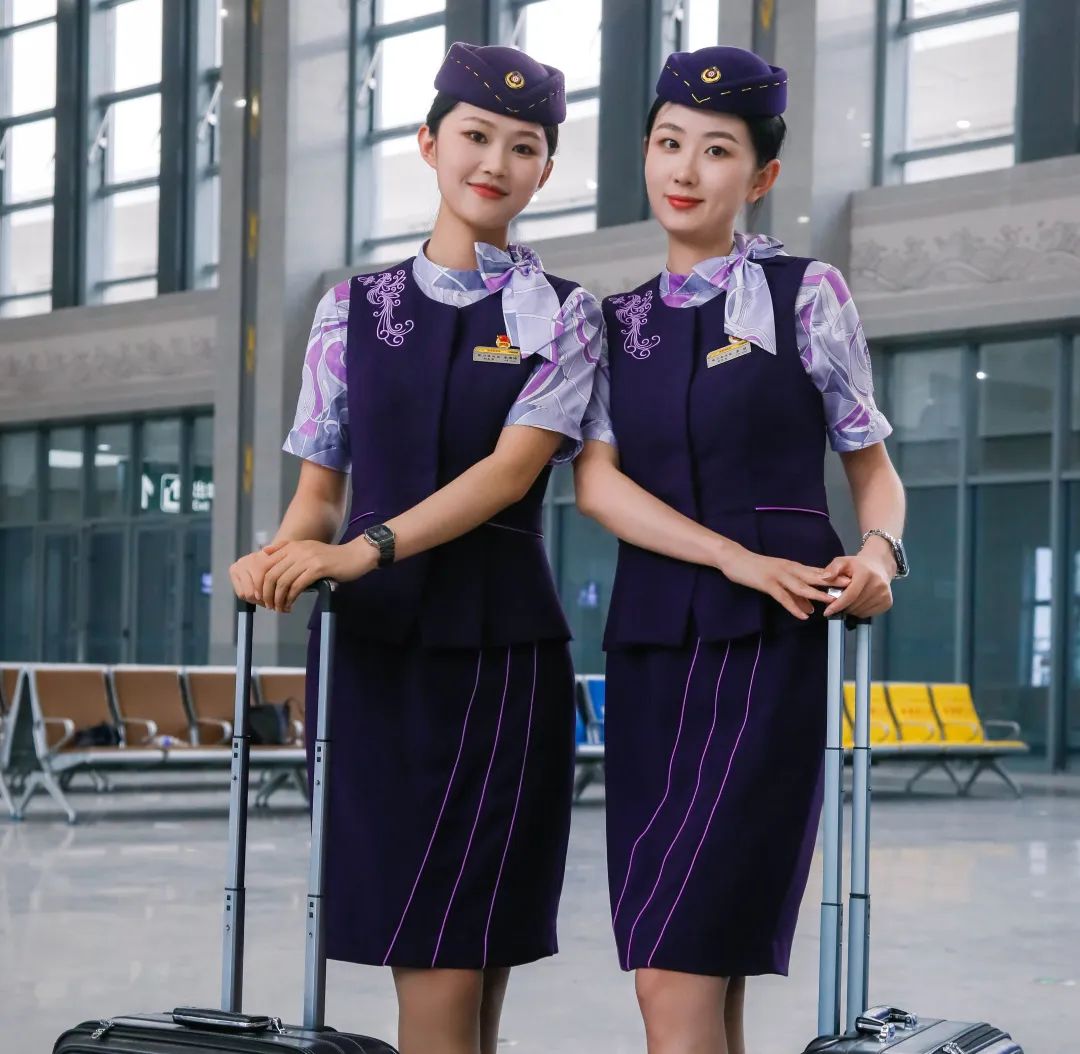 女式制服以紫色为主色调以“凤衔马兰”为设计主题