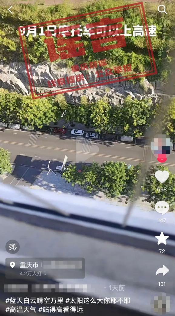 近日,某网民发布视频并称“9月1日摩托车可上重庆高速公路”,引发关注。
