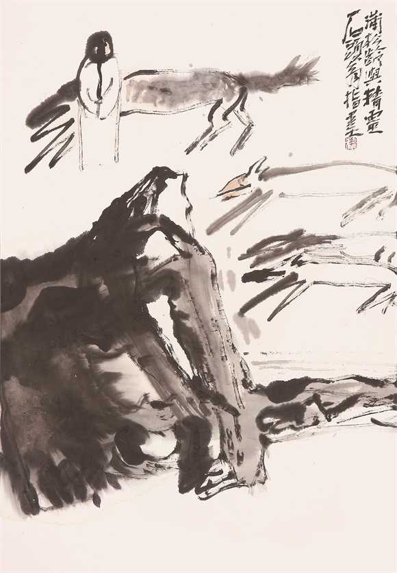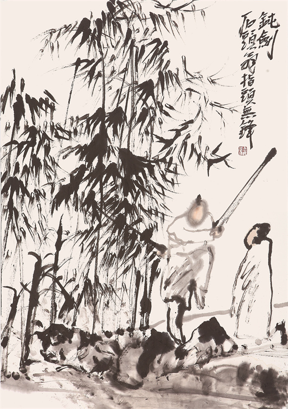 与《黑神话:悟空》游戏中的通关规则一样,在张大石头指墨渲染出的聊斋世界中,每一“关”之间没有固定通道,也没有不可逾越的障碍,只要本领超强或机缘巧合,就可以瞬间往还。从张大石头本人身上,也能发现他与孙悟空这个神话人物之间的一些相似之处:他们都有着不羁的性格和超脱世俗的精神境界。游戏中的孙悟空,厌倦了繁冗天条,辞去佛位,一心归隐花果山;现实中的张大石头,亦不喜繁文缛节、矫情虚伪,他隐居闹市,画室亦与市井为邻。甚至他们使用的“兵器”都有共同的特点:大巧不工、重剑无锋。张大石头在创作指墨作品的过程中,以手为笔,手与心随。他蘸满墨汁的手指,就像孙悟空的金箍棒,可直可屈、随心所欲。你看聊斋系列的《钝剑》那幅画,剑客单腿弯腰,双手挥剑,动作和造型像极了游戏里正举着棍棒打BOSS的“天命人”。