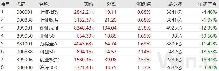 截至8月30日收盘,上证指数涨0.68%报收于2842.21点;深成指涨2.38%报收于8348.48点;创业板指涨2.53%报收于1580.46点。