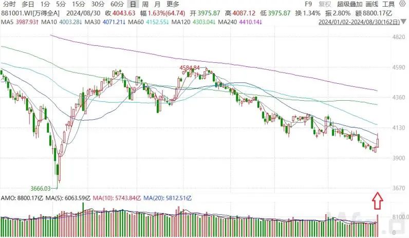 8月30日,万得全A大幅上涨1.63%,成交额为8800亿元,较前一交易日大幅放量,同时也为本月最高成交额。从市场走势来看,当日放量大涨,收盘站上10日均线,盘中一度突破30日均线。在经过前期连续缩量下跌后,当日放量大涨,短期市场底部或得到确认。