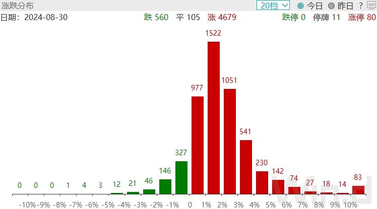 从个股涨幅分布来看,上涨公司数4600多家,涨停公司数80家,下跌公司数500多家,市场呈现普涨态势,人气持续回升。