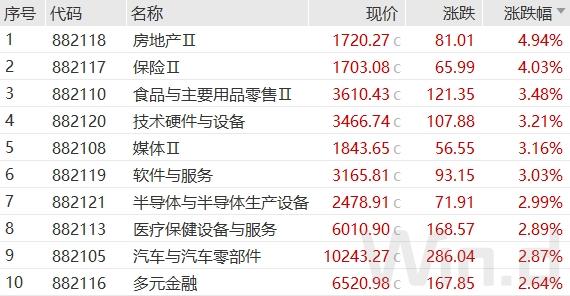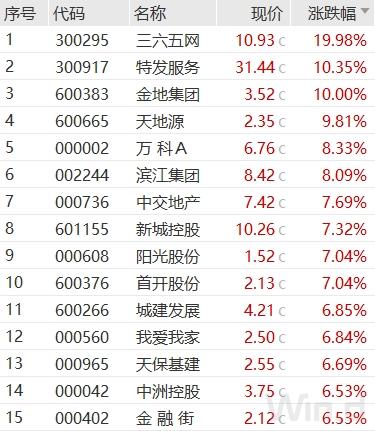 从涨幅居首的房地产板块个股表现来看,三六五网、特发服务、金地集团涨停或涨超10%,天地源、万科A、滨江集团、中交地产、新城控股、阳光股份、首开股份、城建发展、我爱我家、天保基建、中洲控股、金融街等多股大幅拉升。