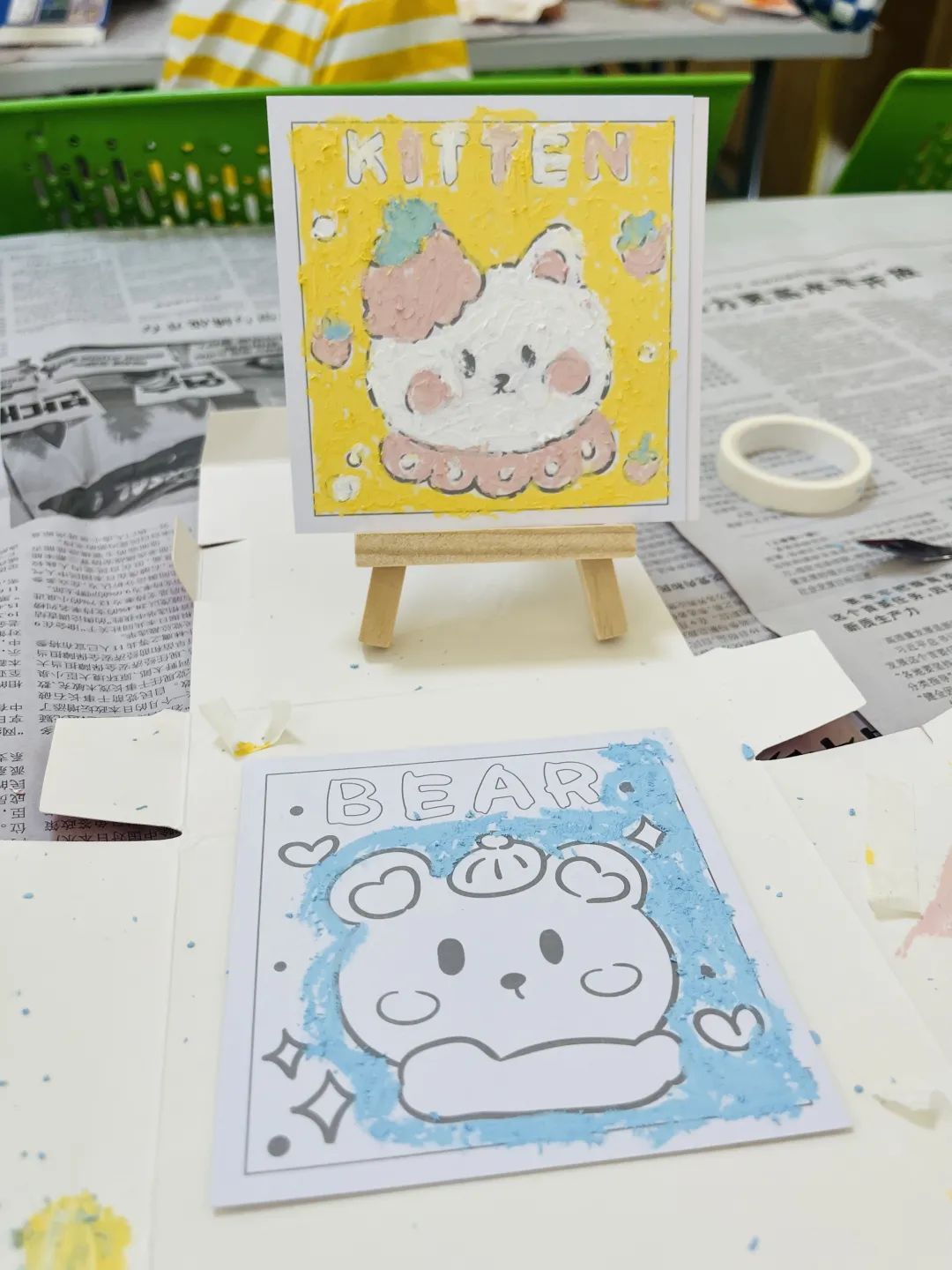 画布上,孩子们自由挥洒,色彩在指尖跳跃,从浅浅的铺色到细腻的刮画,每一笔都凝聚着孩子们的创意与快乐。家长们的加入更是让这份快乐倍增,亲子间的默契与合作,让一幅幅精美的油画作品应运而生。