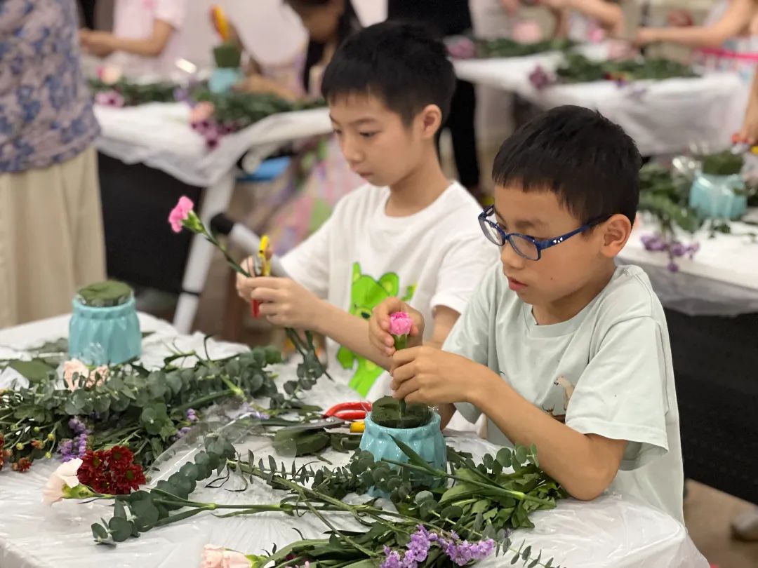 桂林苑居民区还与虹梅街道图书馆联手举办了“花香悦生活,夏日绚丽”插花活动。活动现场,志愿者老师提前准备好各种鲜花,孩子们在老师的指导下,认真学习插花技巧,充分发挥想象力,创作出一个个美丽且各具特色的插花作品。不少家长纷纷用手机记录下这美好的时刻,孩子们则表示要将鲜花献给父母,表达对他们的爱。
