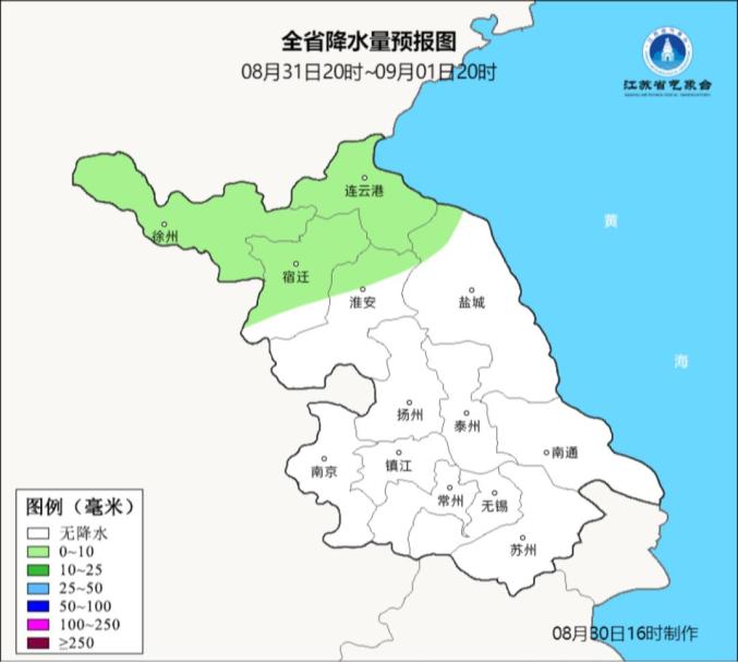 最高温度:沿江和苏南地区34℃左右,淮北地区29~30℃,其他地区32℃左右;