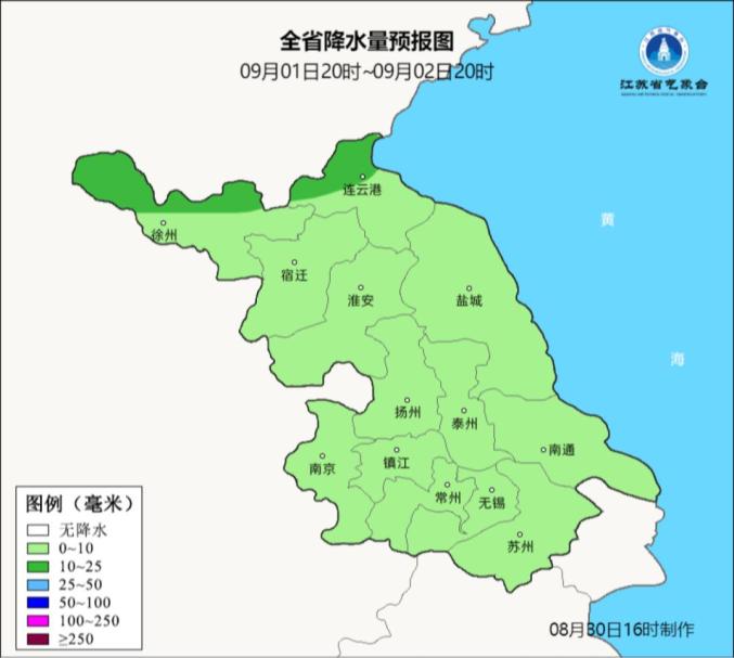 预计今年9月降水量淮北地区和江淮之间较常年偏少0~2成,苏南地区较常年偏多0~2成。全省范围内有3次降水过程,发生时段为:9月上旬前中期、9月中旬后期和9月下旬中后期。