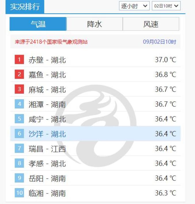 9月2日上午10时的全国气温排行榜,湖北多地上榜。今年我国南方地区高温影响范围广、持续时间长、极端性强,浙江、上海、江苏、江西、重庆等多地部分地区高温日数达到25天以上,较常年同期偏多10至15天,超过250个站次追平或打破当地单日气温极值。