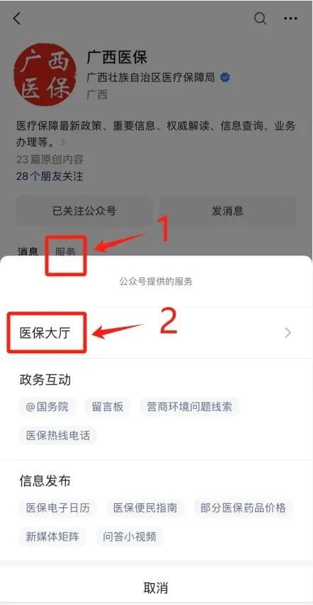 在微信中依次点击微信右下角“我”→“服务”→“城市服务”→选择热门服务中的“社保”→“社保缴费”→进入“广西社保缴纳”→“城乡居民医疗保险”→输入身份证号码及姓名→选择缴费年度→完成支付。5.支付宝市民中心