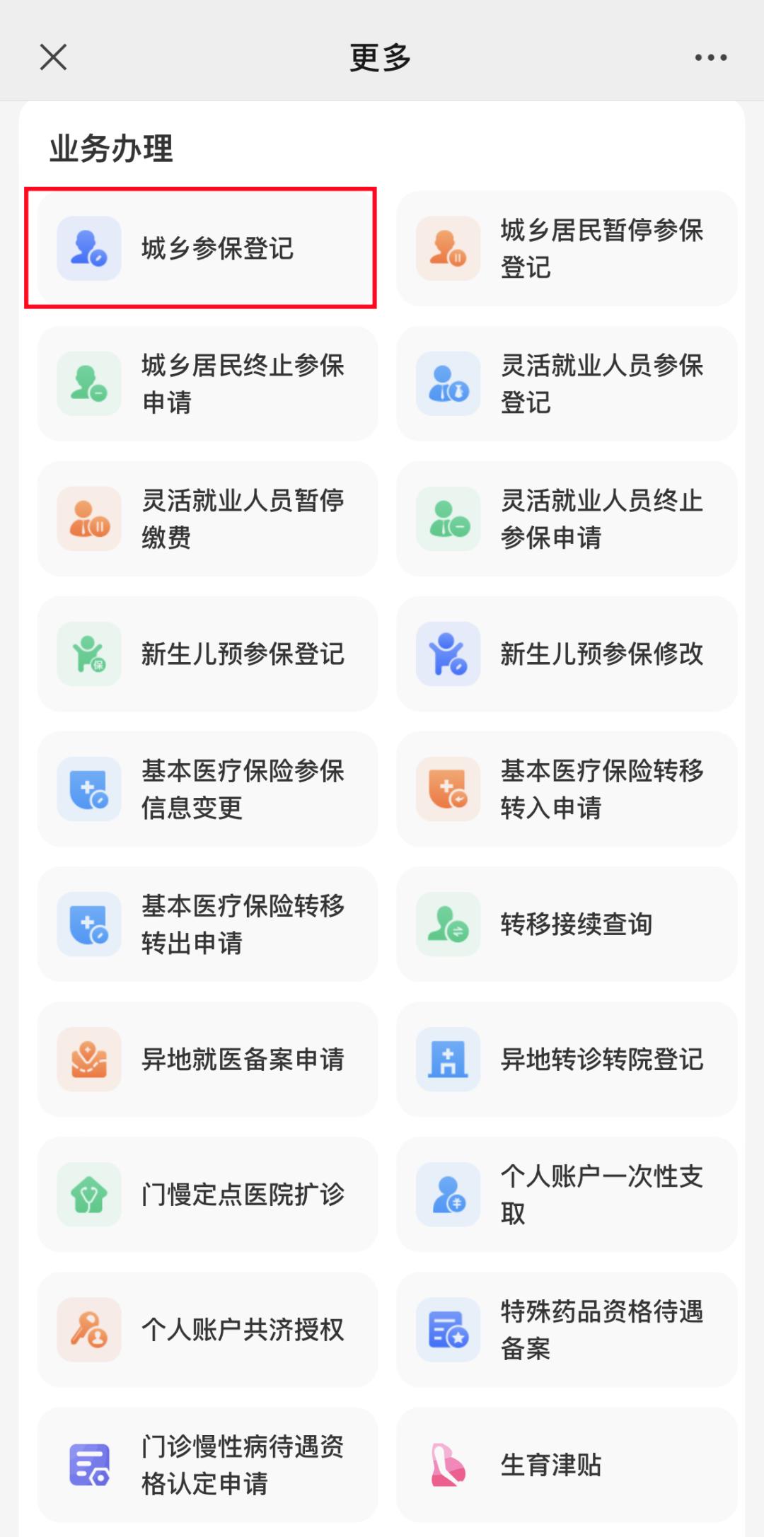选择“城乡参保登记”进入登记页面,即可根据提示填写信息并上传材料电子影像后完成申报左右滑动查看更多