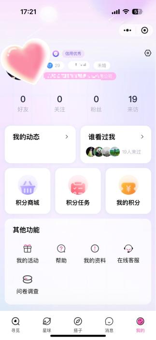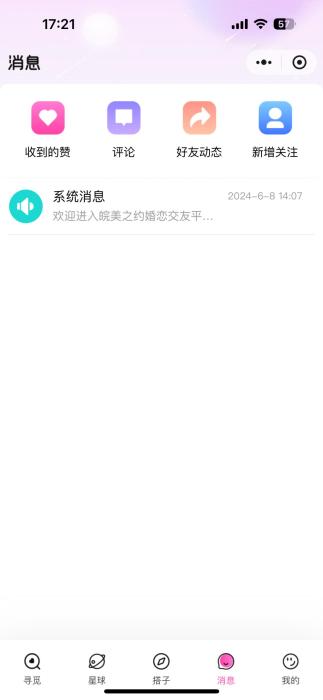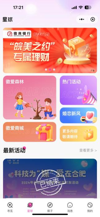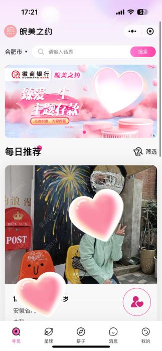 最新上线试运营的“皖美之约”婚恋交友小程序由5个功能版块组成,分别为“寻觅”“星球”“搭子”“消息”和“我的”。