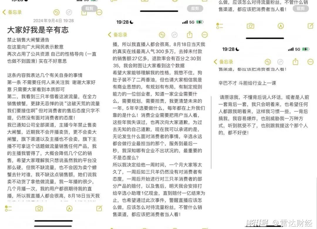9月4日晚,辛巴发布长文称,已通知公司全部渠道,主播今年禁止售卖大闸蟹,“近期我不会开播卖货,更不会卖大闸蟹”,辛巴表示禁售大闸蟹将会降低几个亿的销售额,自己不缺流量,也不会因为卖大闸蟹针对谁。