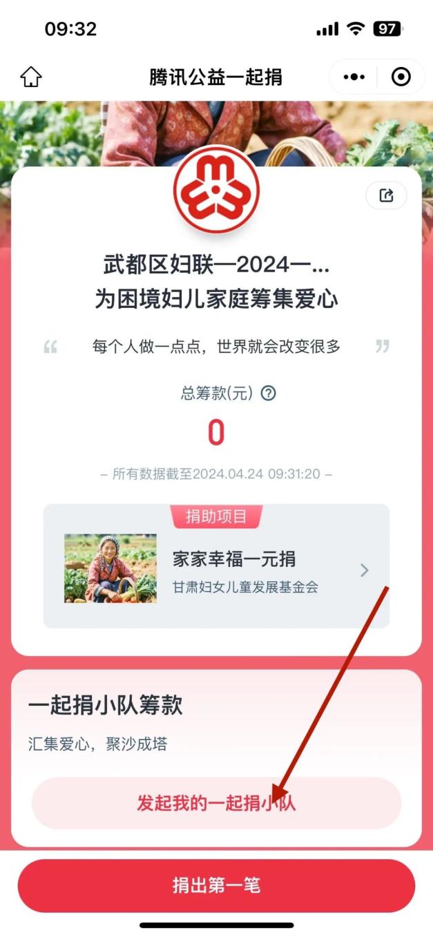 1.识别武都区妇联——2024一元捐”二维码进入“为困境妇儿家庭筹集爱心”(家家幸福一元捐)的界面。