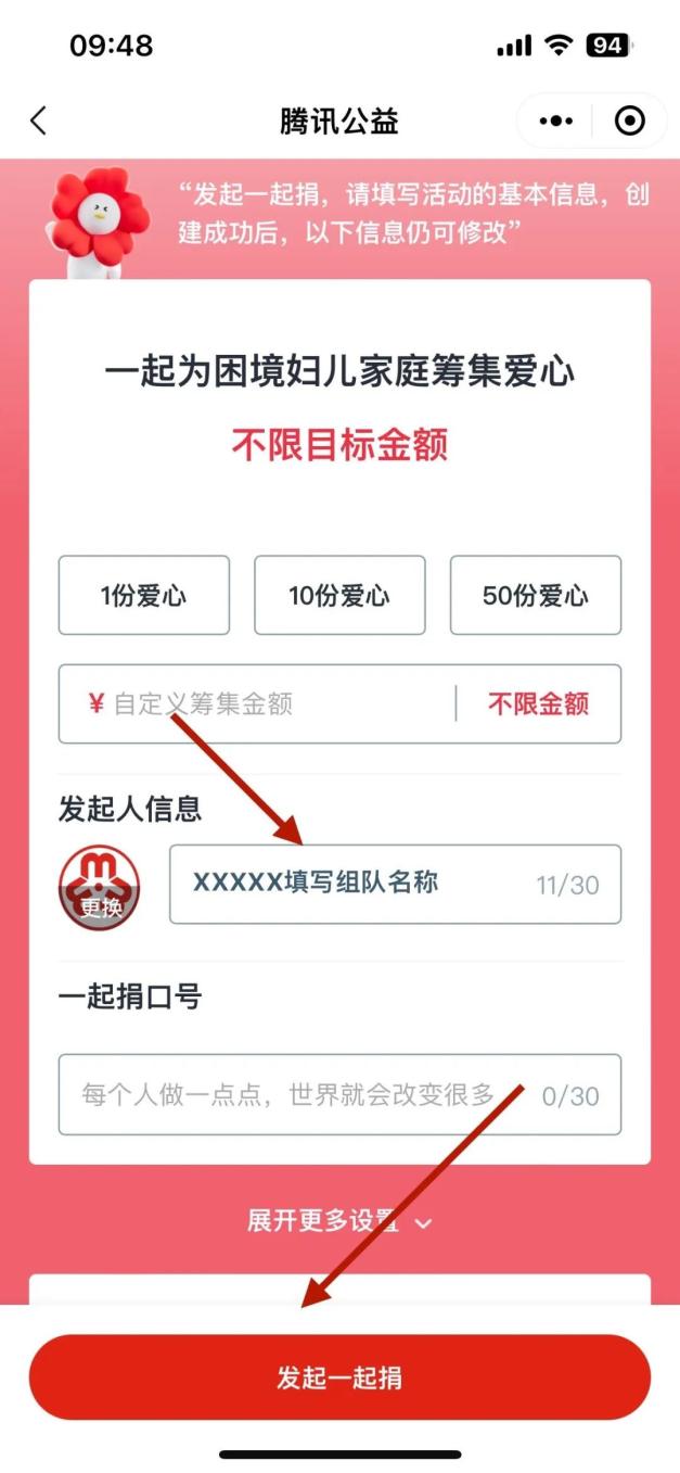2、点击下方“发起我的一起捐小队”选项,建立新的团队,所组建的团队名称以各自单位命名(格式:XX单位—2024一元捐)。