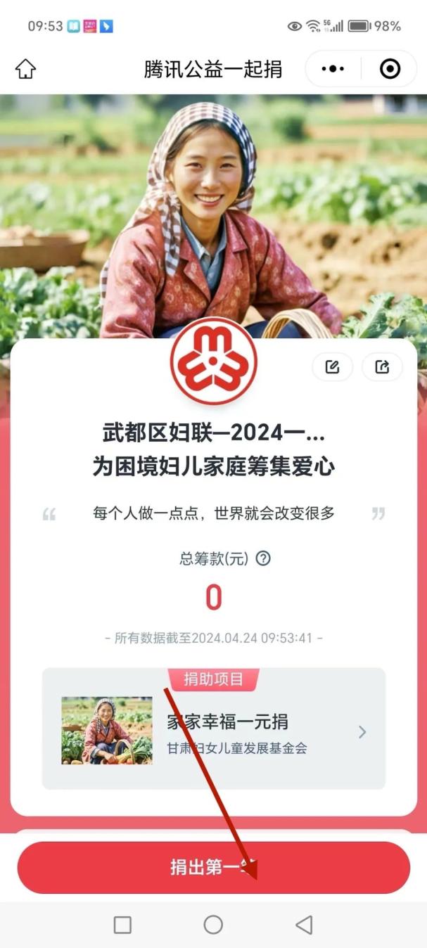 个人捐款识别“武都区妇联—2024一元捐”二维码进入“为困境妇儿家庭筹集爱心”(家家幸福一元捐)的界面,点击下方“捐一笔”即可。