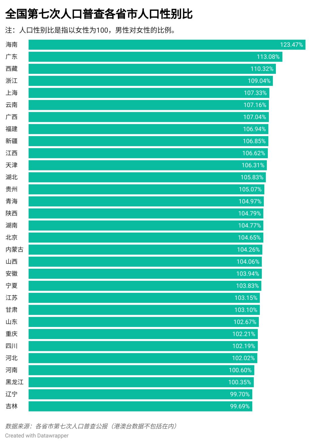 据七普数据,从各省市的人口性别比看,海南的人口性别比最高,达123.47;其次,广东、西藏、浙江、上海、云南、广西6个省市的性别比均超过正常范围。而全国总人口性别比为105.07,有13个省份超过了全国平均水平。男多女少,自然导致有一部分男性无法娶妻。