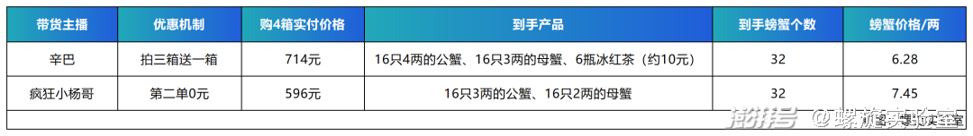 螺旋实验室同时还注意到,去年秋天蟹太太就曾经和疯狂小杨哥合作带货,当时双方主推的产品机制是199元到手8只2.5两的母蟹。