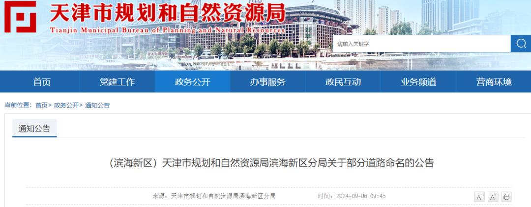 今天(9月6日),天津市规划和自然资源局滨海新区分局发布公告,为适应城市管理和人民群众生活需要,决定对部分道路予以命名,现公告如下: