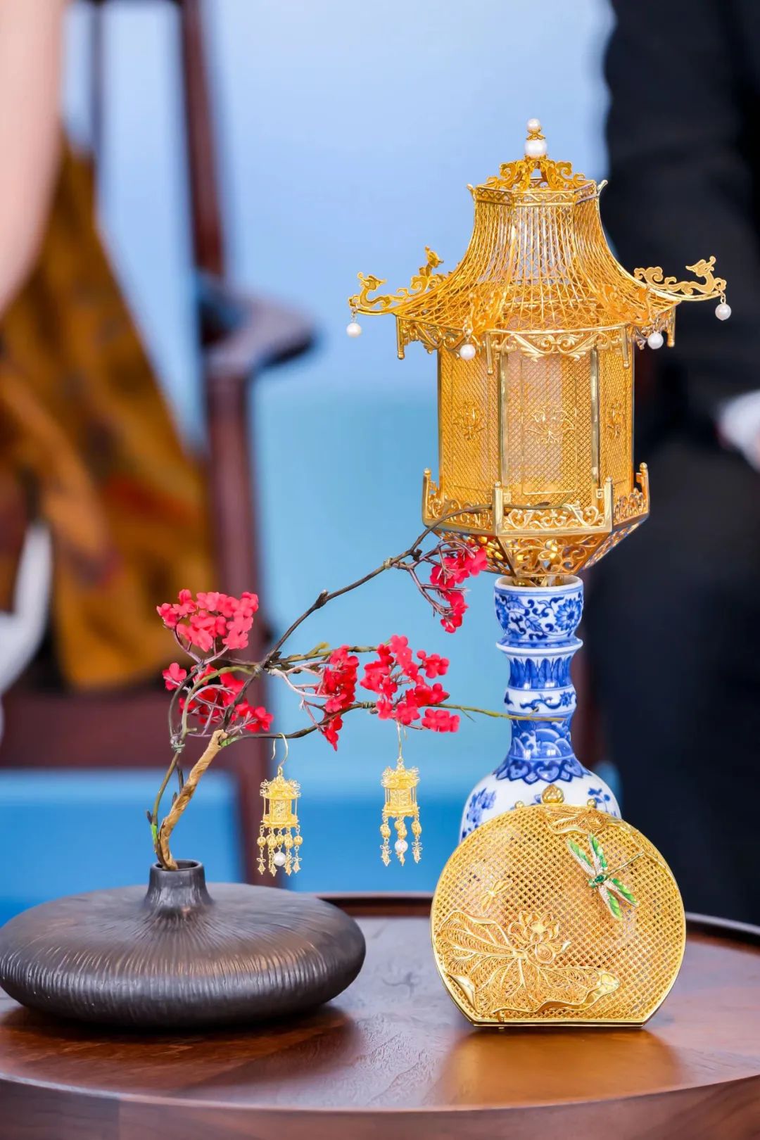 《螭龙宫灯》借鉴故宫宫廷御用的精美花灯,运用国家非物质文化遗产花丝镶嵌工艺手工精制而成。此作品仿若宫廷建筑,六角饰以螭龙,更巧妙地将龙的前足着地、长尾盘卷等设计元素融入,寓意美好吉祥。手提宫灯,灯影摇曳,金螭盘踞,雍容华贵,尽展宫廷气派。