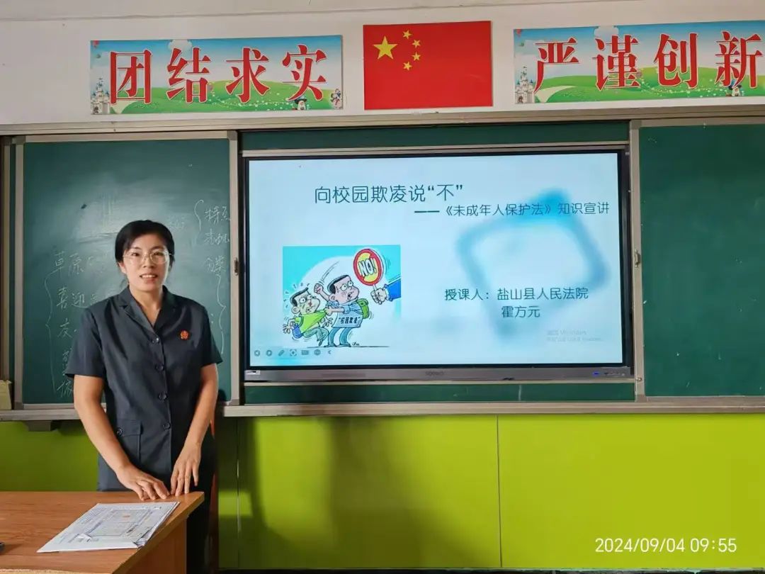 9月4日上午,盐山法院法官助理霍方元到盐山县小庄中心小学为孩子们上了一堂法治课程。根据学生的年龄和心理特征,以形象直观的视频素材,通过以案说法,对校园欺凌的定义、危害以及应对策略展开讲解,加深了青少年的自我防护意识。引导同学们树立正确的世界观、人生观和价值观。课后孩子们纷纷表示听了这节课知道了校园欺凌的危害,以后会远离校园欺凌,好好学习,为国家做贡献。曾小营小学法治副校长窦金杰: