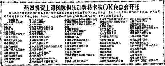 1988年,黄楼“卡拉OK”在上海国际俱乐部开张营业,紧随其后,设在锦江饭店碧丽宫内的“卡拉OK”和设在陕西北路延中汉堡包公司的“卡拉OK”也纷纷开张,它们都在报纸上刊登了广告,告诉上海市民,一种集饮酒、唱歌、跳舞乐趣之大成的娱乐形式来了。