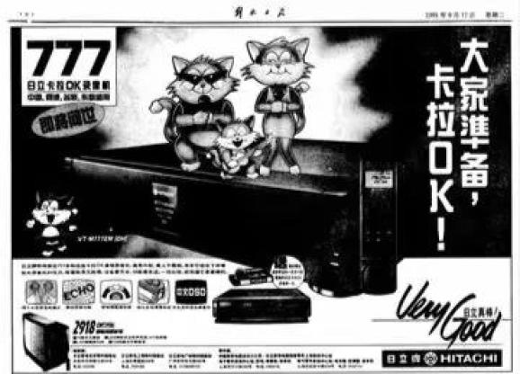 日立777广告邱大王记得,读小学四五年级时,一幢楼里好几家人家购买了同款777卡拉OK录像机。“要2000多块呢,和电视机一样贵,还送了一盘卡拉OK录像带。”