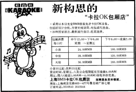 黄楼卡拉OK广告虽然贵,但上海哪个时代都不缺有钱人,和喜欢赶时髦的人,所以这种娱乐形式很快在全市范围内散播开来。